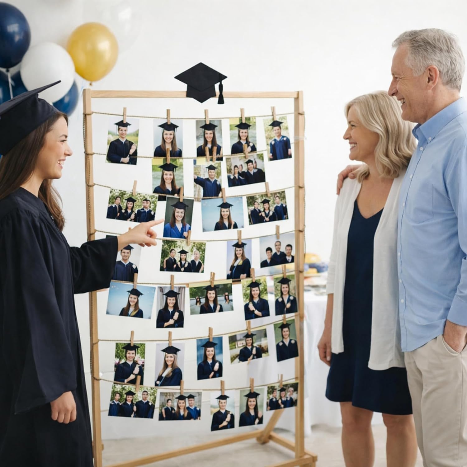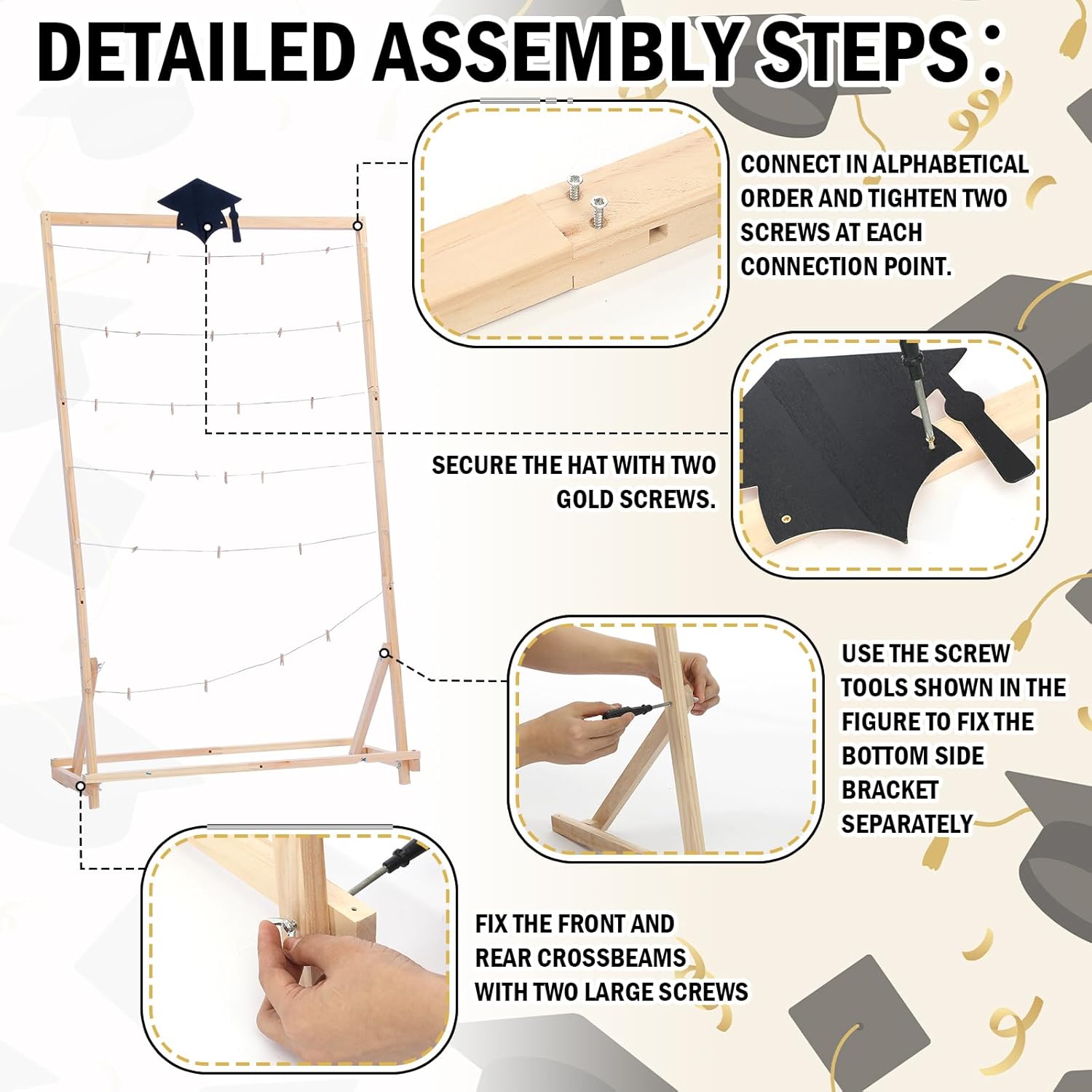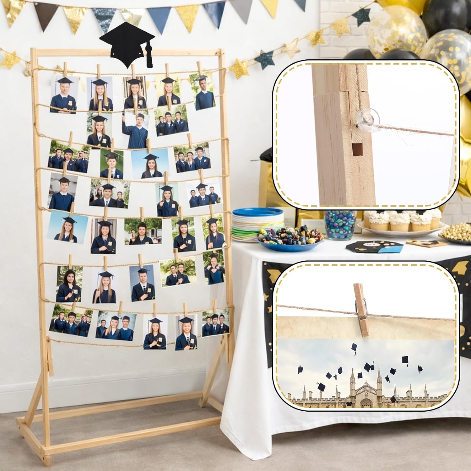 Features: Our class of 2026 grad centerpieces come with complete assembly tools. The setup steps are straightforward and require no professional skills, saving time and effort for users. The stable structure after assembly ensures safe display and allows easy adjustment or replacement of items at any time. 2026 Graduation photo display stand adopts classic graduation cap decorations to create a strong graduation atmosphere. It serves as an attractive visual centerpiece for graduation events and helps display photos cards and blessings easily. The themed design matches class of 2026 celebrations. Specifications: Material: wood Color: mainly natural wood Size: 47 x 27 inches/ 119.38 x 68.58 cm (LxW) Hemp rope: 32.81 ft/ 10 m (L) Package includes: 1 x Graduation photo display stand 100 x Clips 1 x Hemp rope Notes: Manual measurement, please allow slight errors on size. The color may exist a slight difference due to different screen displays